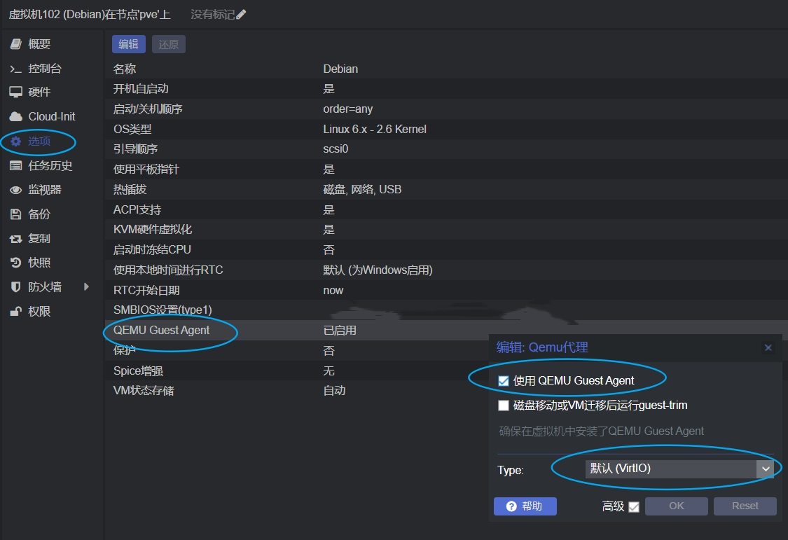 qm <命令> <vmid> [选项] qm [create|set] <vmid> # 创建虚拟机 --memory <MBYTES> memory in MB (64 - 8192) --sockets <N> set number of CPU sockets <N> --cores <N> set cores per socket to <N> --ostype NAME specify OS type --onboot [yes|no] start at boot --keyboard XX set vnc keyboard layout --cpuunits <num> CPU weight for a VM --name <text> set a name for the VM --description <text> set VM description --boot [a|c|d|n] specify boot order --bootdisk <disk> enable booting from <disk> --acpi (yes|no) enable/disable ACPI --kvm (yes|no) enable/disable KVM --tdf (yes|no) enable/disable time drift fix --localtime (yes|no) set the RTC to local time --vga (gd5446|vesa) specify VGA type --vlan[0-9u] MODEL=XX:XX:XX:XX:XX:XX[,MODEL=YY:YY:YY:YY:YY:YY] --ide<N> [volume=]volume,[,media=cdrom|disk] [,cyls=c,heads=h,secs=s[,trans=t]] [,cache=none|writethrough|writeback] [,snapshot=on|off][,cache=on|off][,format=f] [,werror=enospc|ignore|report|stop] [,rerror=ignore|report|stop] [,backup=no|yes] --ide<N> <GBYTES> create new disk --ide<N> delete remove drive - destroy image --ide<N> undef remove drive - keep image --cdrom <file> is an alias for --ide2 <file>,media=cdrom --scsi<N> [volume=]volume,[,media=cdrom|disk] [,cyls=c,heads=h,secs=s[,trans=t]] [,snapshot=on|off][,format=f] [,cache=none|writethrough|writeback] [,werror=enospc|ignore|report|stop] [,backup=no|yes] --scsi<N> <GBYTES> create new disk --scsi<N> delete remove drive - destroy image --scsi<N> undef remove drive - keep image --virtio<N> [volume=]volume,[,media=cdrom|disk] [,cyls=c,heads=h,secs=s[,trans=t]] [,snapshot=on|off][,format=f] [,cache=none|writethrough|writeback] [,werror=enospc|ignore|report|stop] [,rerror=ignore|report|stop] [,backup=no|yes] --virtio<N> <GBYTES> create new disk --virtio<N> delete remove drive - destroy image --virtio<N> undef remove drive - keep image