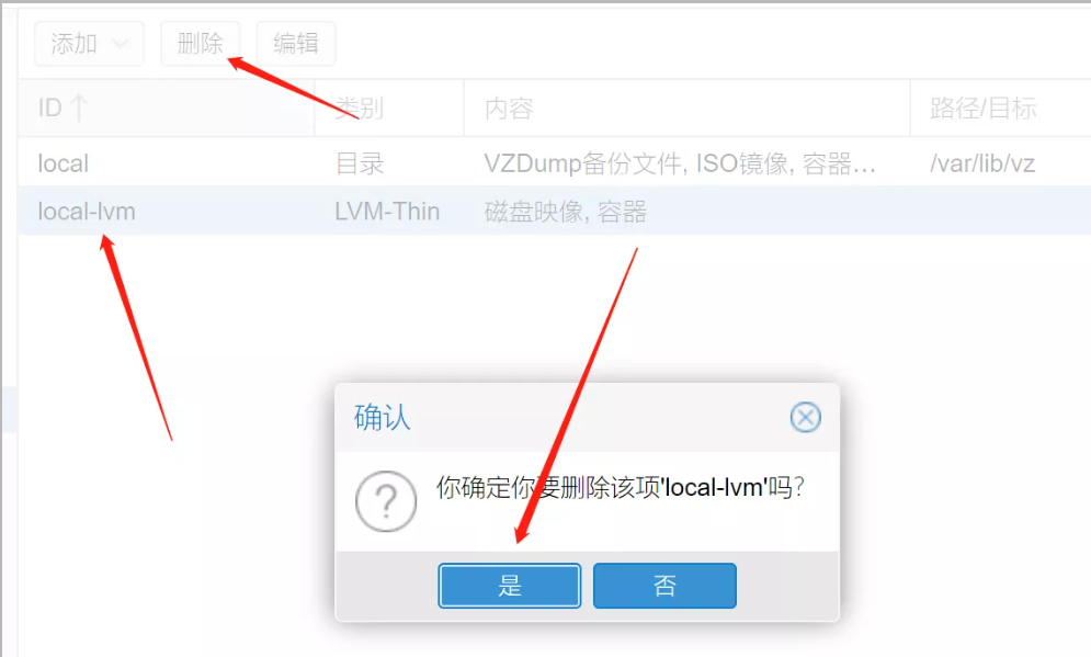 # 删除 local-lvm 千万注意备份一下 pve/data/ 目录下的 disk 虚拟磁盘文件 PVE8.2.2我照着这么操作直接把磁盘文件给删掉了,我人都傻了。。。。。 # 后面几个就是在删除磁盘文件 lvremove pve/data Removing pool pve/data will remove 3 dependent volume(s). Proceed? [y/n]: y Do you really want to remove active logical volume pve/vm-220-disk-0? [y/n]: y Logical volume "vm-220-disk-0" successfully removed. Do you really want to remove active logical volume pve/vm-300-disk-0? [y/n]: y Logical volume "vm-300-disk-0" successfully removed. Do you really want to remove active logical volume pve/vm-220-disk-1? [y/n]: y Logical volume "vm-220-disk-1" successfully removed. Do you really want to remove active logical volume pve/data? [y/n]: y Logical volume "data" successfully removed.